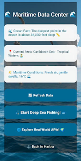 ที่หัวใจของแอปคือระบบแบบทดสอบที่มีสามระดับความยาก ทำให้ผู้ใช้สามารถทดสอบความรู้เกี่ยวกับมหาสมุทรวิทยาและชีววิทยาทางทะเล การจำลองการตกปลามอบประสบการณ์ที่แท้จริงที่ผู้เล่นสามารถจับปลาหลายชนิดและรับคะแนน ด้วยร้านค้าในเกมที่มีความเคลื่อนไหว ผู้ใช้สามารถซื้ออุปกรณ์โดยใช้คะแนนจากแบบทดสอบและการตกปลา สารานุกรมการศึกษามีให้ใช้งานแบบออฟไลน์ พร้อมด้วยการอัปเดตแบบเรียลไทม์เกี่ยวกับชีวิตทางทะเล เพื่อให้แน่ใจว่าผู้ใช้มีข้อมูลที่มีค่าให้เข้าถึงได้ตลอดเวลา